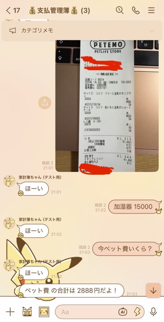 レシート画像はもちろん、テキストでもいいし、今食費いくら?って送ったら現在までの食費の合計教えてくれたり、
